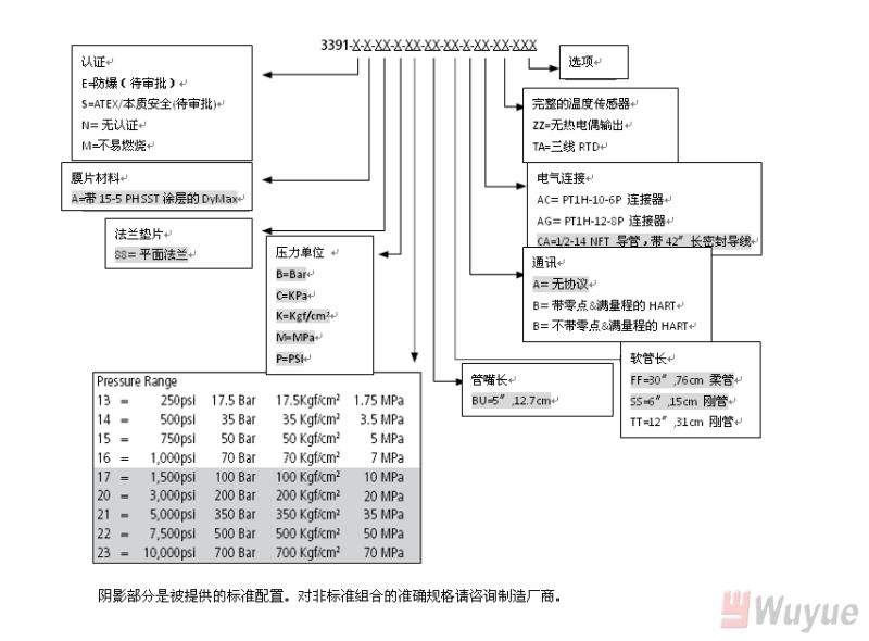 輸出,模擬:4-20mA(標(biāo)準(zhǔn)壓力,溫度可選) 輸出,數(shù)字:HART 綜合精度(錯(cuò)誤)(20-100%滿量程): ±0.15%滿量程(3M和3M以上) +0.25%滿量程(1.5M和1.5以下) 溫度漂移(77-572℉,25-300℃):0.001%滿量程/℉,最大(0.001%滿量程/℃,最大) 重復(fù)性:±0.1%滿量程 爆破額定壓力:2X滿量程 超壓 額定:1.5X滿量程 量程:1,500至10,000psi 可調(diào)范圍:6:1調(diào)節(jié)比,向下 負(fù)載電阻:250歐姆@18Vdc;500歐姆@23Vdc |